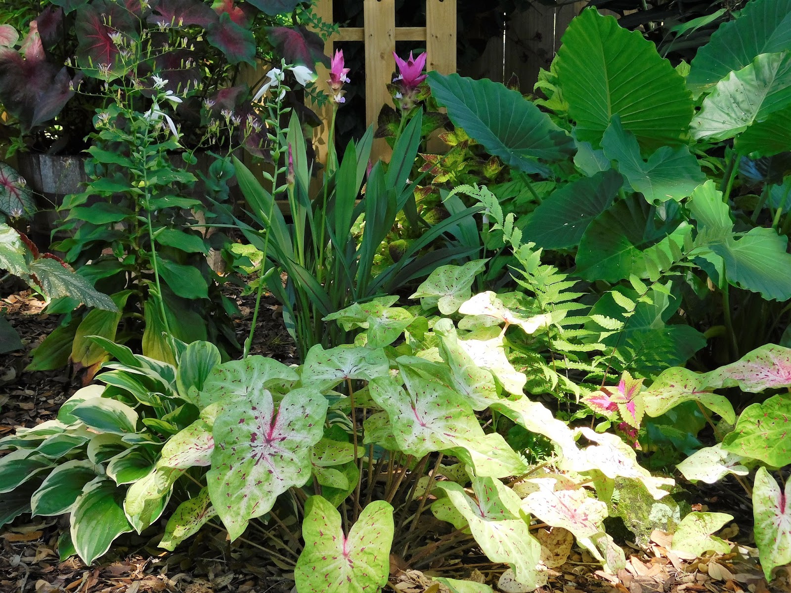 I retreated to the coolness (or less hot) back yard, under the oak canopy. The shade gardens are as colorful as any flower garden, and best of all, they need little attention once planted. I have caladiums everywhere and as they return each year they keep getting larger. I've got pots of single varieties...